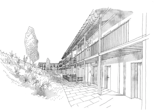 Ces dernières parcelles du plan urbain participent donc à la transition de la ville vers le bois et du bois vers la ville. Nous parlons d’une lisière épaisse habitée où une attention particulière est apportée à la qualification des espaces extérieurs et à l’articulation des volumes au sein du quartier.
